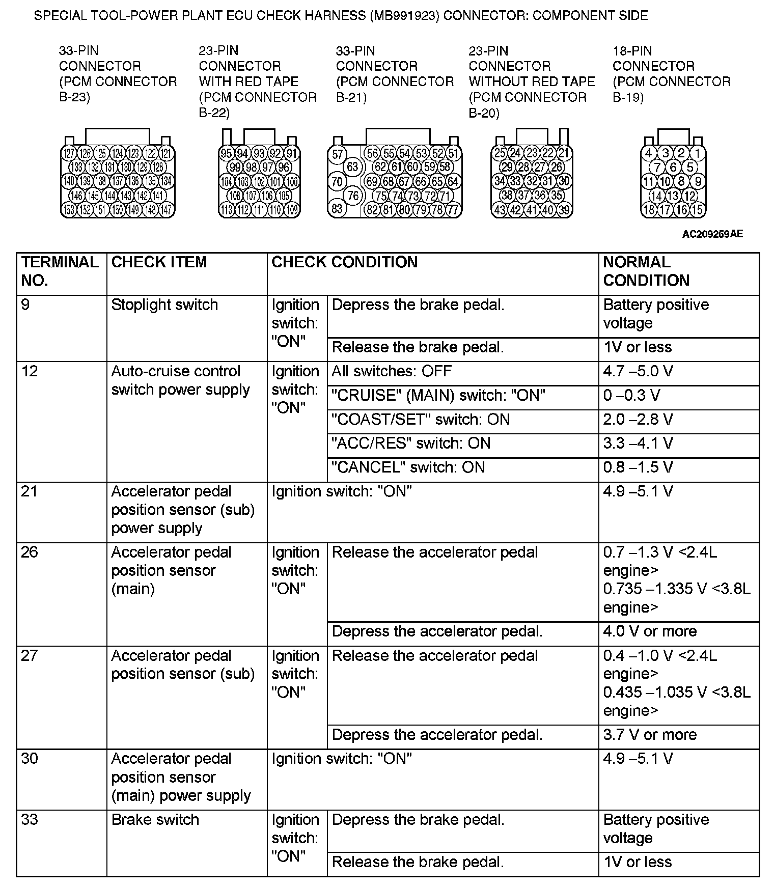 PCM TERMINAL VOLTAGE REFERENCE CHART FOR AUTO-CRUISE CONTROL SYSTEM OPERATIONSpecial Tool-Power Plant ECU Check Harness (MB991923) Connector: Component Side Part 1: