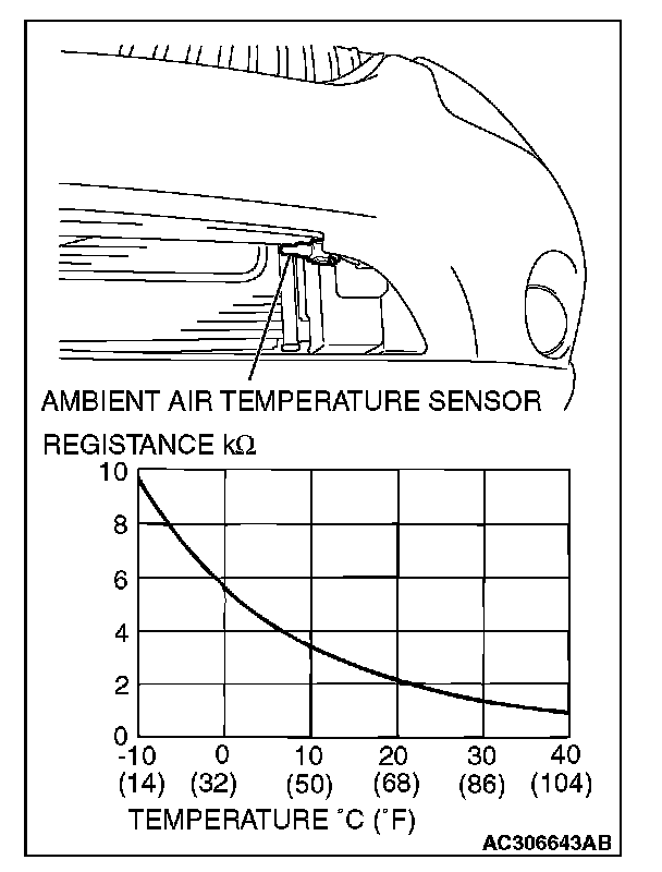 The ambient air temperature sensor should be checked in situ. Once the sensor is removed, it is rendered unserviceable. Measure the resistance between the sensor terminals under at least two temperatures. The resistance values should meet the values shown.