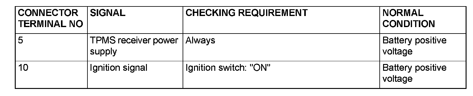 CHECK AT TPMS RECEIVERTERMINAL VOLTAGE CHECK CHART
