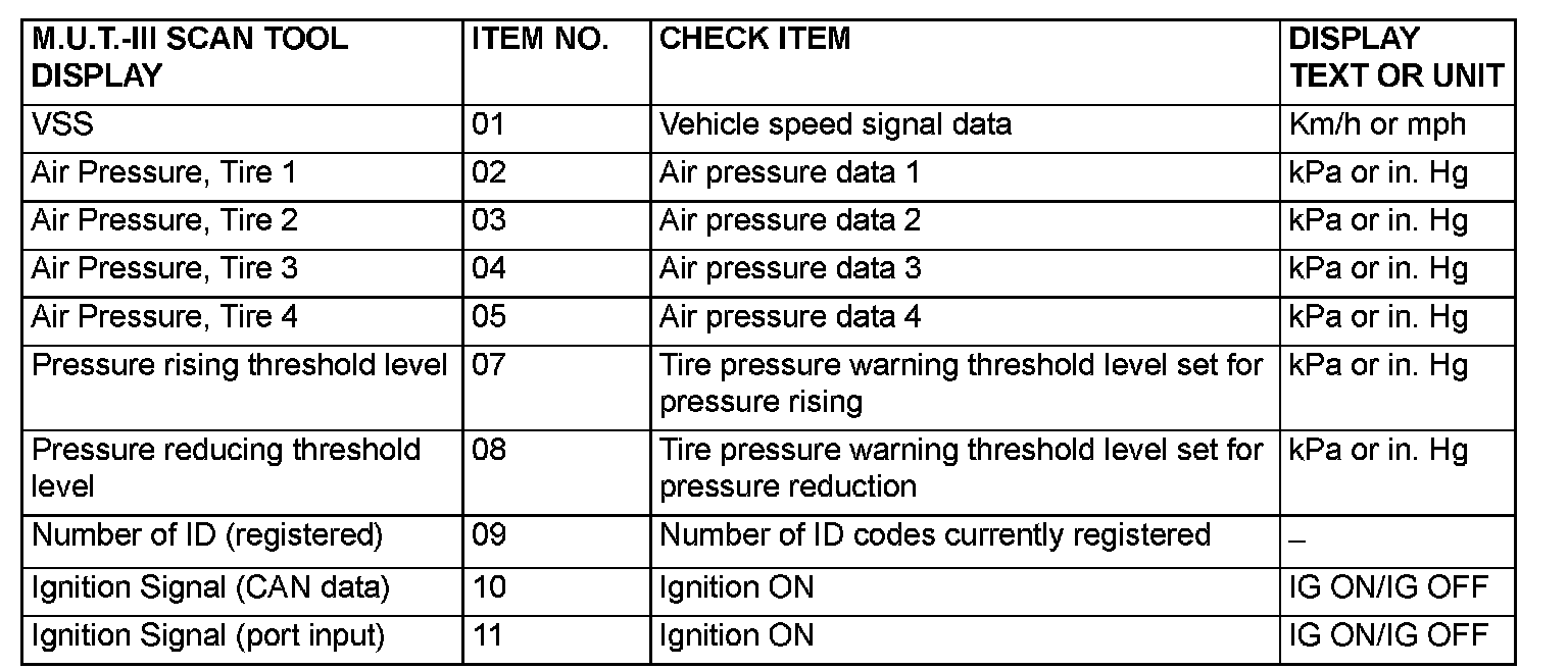 TPMS SERVICE DATA LIST