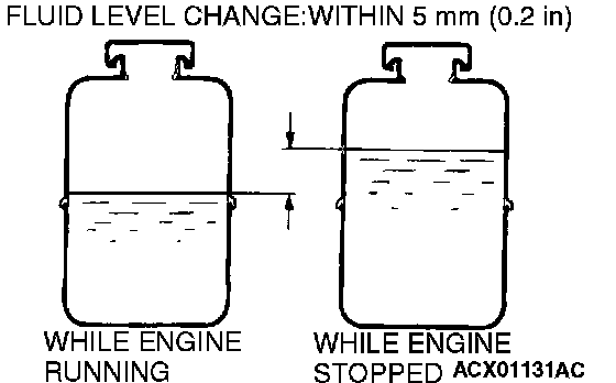 4. Check the fluid in the oil reservoir for foaming or milkiness. Check the difference of the fluid level when the engine is stopped, and while it is running. If the fluid contains air or has milky appearance, or the fluid level fluctuate by 5 mm (0.2 inch) or more, power steering system air bleeding should be done.