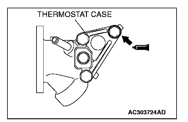 2. Apply a bead of the sealant to the cylinder head mating surface of the thermostat case as shown.