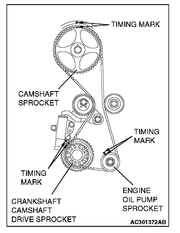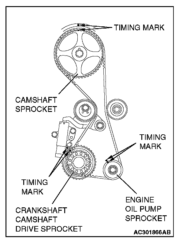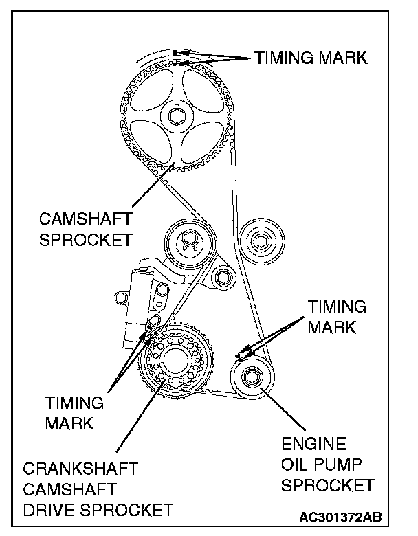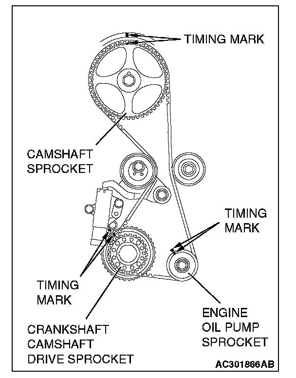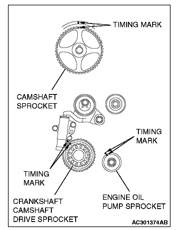 1. Align the timing marks on the camshaft sprocket, crankshaft camshaft drive sprocket and engine oil pump sprocket.