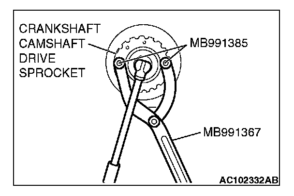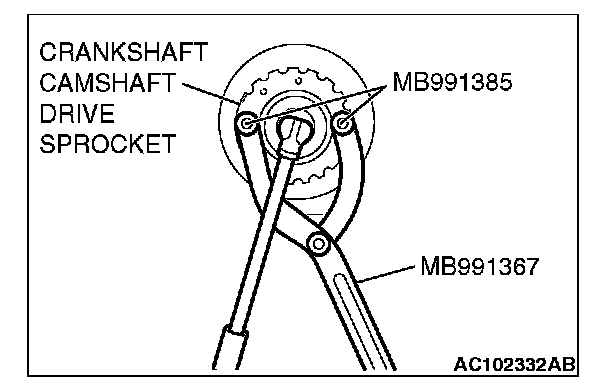 1. Hold the crankshaft camshaft drive sprocket with special tools MB991367 and MB991385.