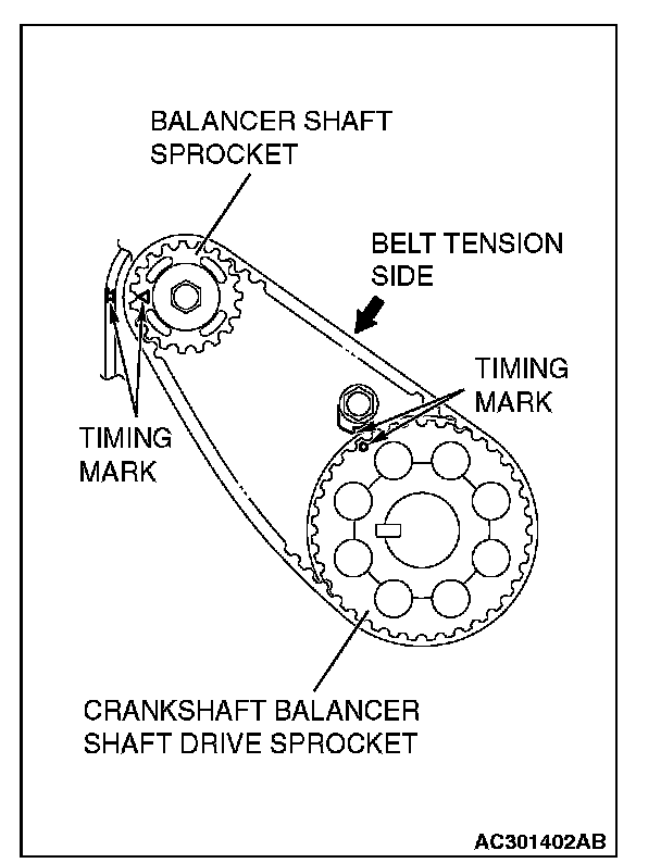 2. Install the balancer timing belt on the crankshaft balancer shaft drive sprocket and balancer shaft sprocket. There should be no slack on the tension side.