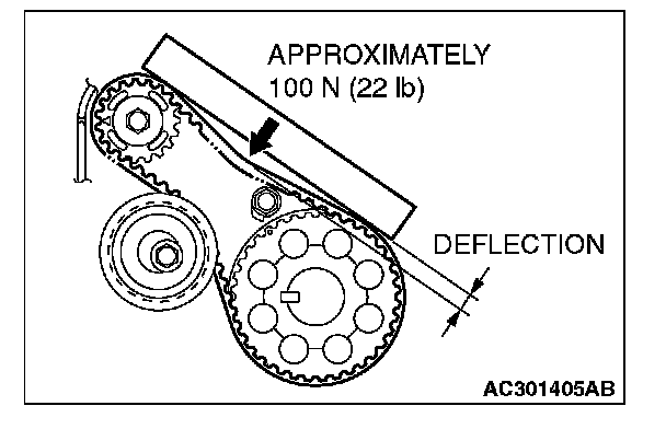3. Apply a pressure of approximately 100 N (22 pounds) at the center (arrow area) between the sprocket as shown in the figure, then inspect whether the belt deflection is within the standard value.