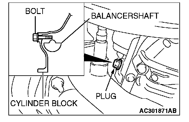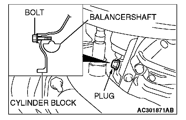 2. Adjust the timing mark of the engine oil pump sprocket. Unplug the cylinder block plug. Insert a bolt (M6, section width 10 mm, nominal length 45 mm) from the plug hole. If the bolt comes in contact with the balancer shaft, turn the engine oil sprocket one rotation. Re-adjust the timing mark and then check to see that the bolt fits. Do not remove the bolt until the valve timing belt is assembled.