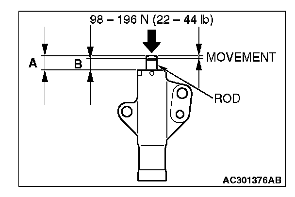 3. Hold the timing belt tensioner adjuster by hand, and press top end of the rod onto the metal (e.g. cylinder block) under a pressure of 98 - 196 N (22 44 pounds) to measure the movement of the rod.