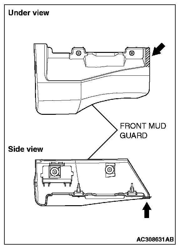 ^ If the assembling support area contacts with the front mud guard (arrow area as shown in the illustration), the front mud guard will be damaged. Slide the assembling support area to the front of the vehicle slightly to prevent the damage.