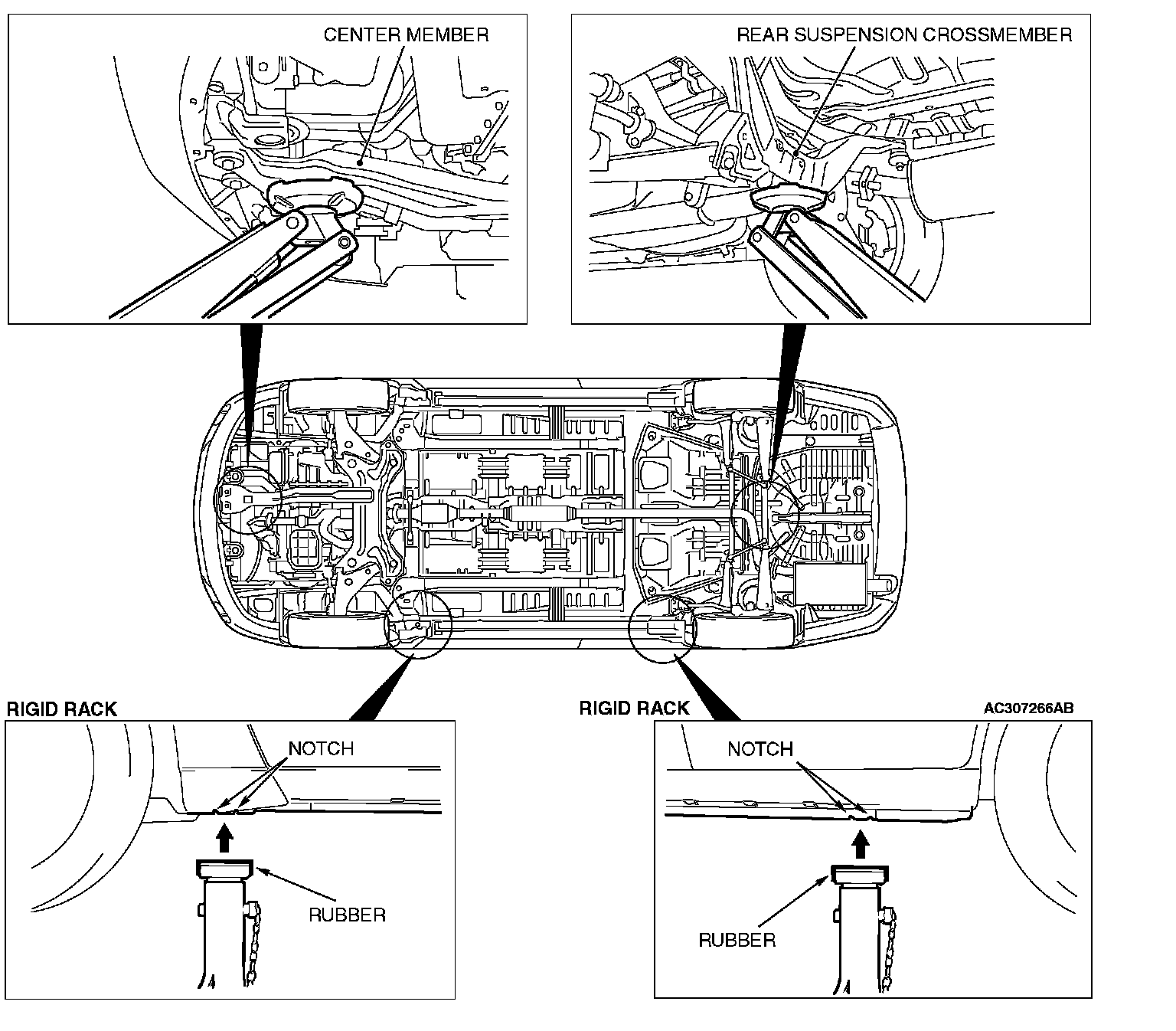 ^ For lifting, put rubber or similar material between the side sill and rigid rack, otherwise the side sill area will be damaged.