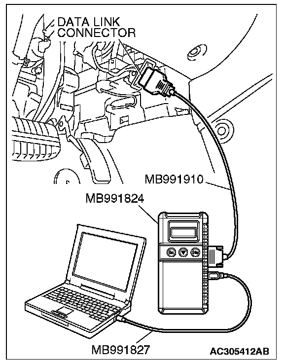 CAUTION: To prevent damage to scan tool MB991958, always turn the ignition switch to the "LOCK" (OFF) position before connecting or disconnecting scan tool MB991958.