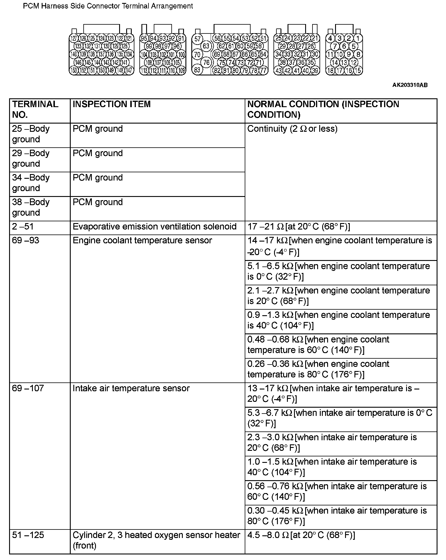 PCM Harness Side Connector Terminal Arrangement Part 1: