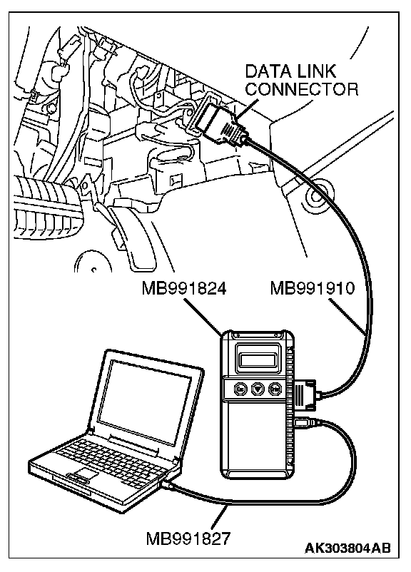 NOTE: Disconnecting the scan tool MB991958 is the reverse of the connecting sequence, making sure that the ignition switch is at the "LOCK" (OFF) position.