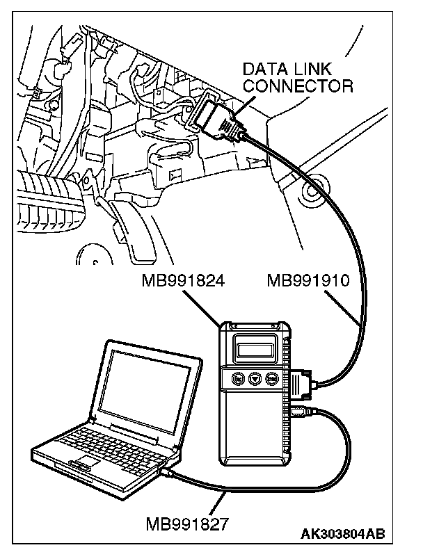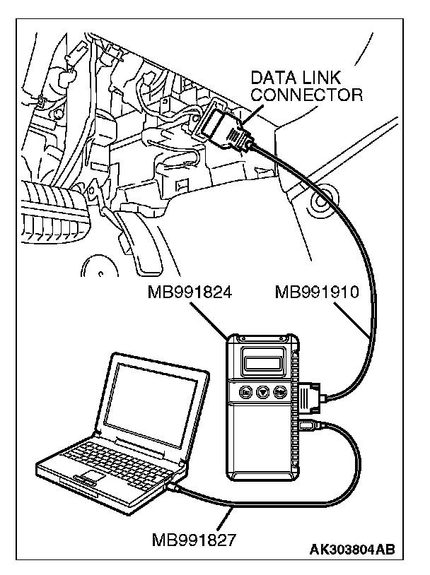 CAUTION: To prevent damage to scan tool MB991958, always turn the ignition switch to the "LOCK" (OFF) position before connecting or disconnecting scan tool MB991958.
