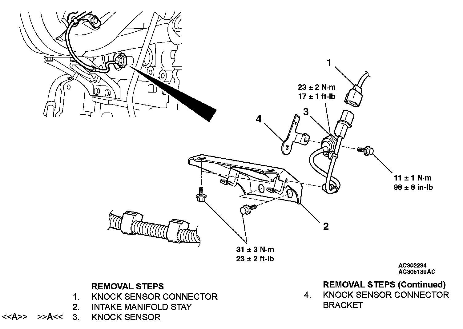 CAUTION: When the knock sensor replacement is performed, use scan tool MB991958 to initialize the learning value (Refer to Initialization Procedure for Learning Value in MFI Engine).