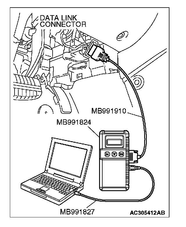 CAUTION: To prevent damage to scan tool MB991958, always turn the ignition switch to the "LOCK" (OFF) position before connecting or disconnecting scan tool MB991958.