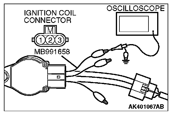 1. Disconnect the ignition coil connector, and connect the test harness special tool (MB991658) between the separated connector.