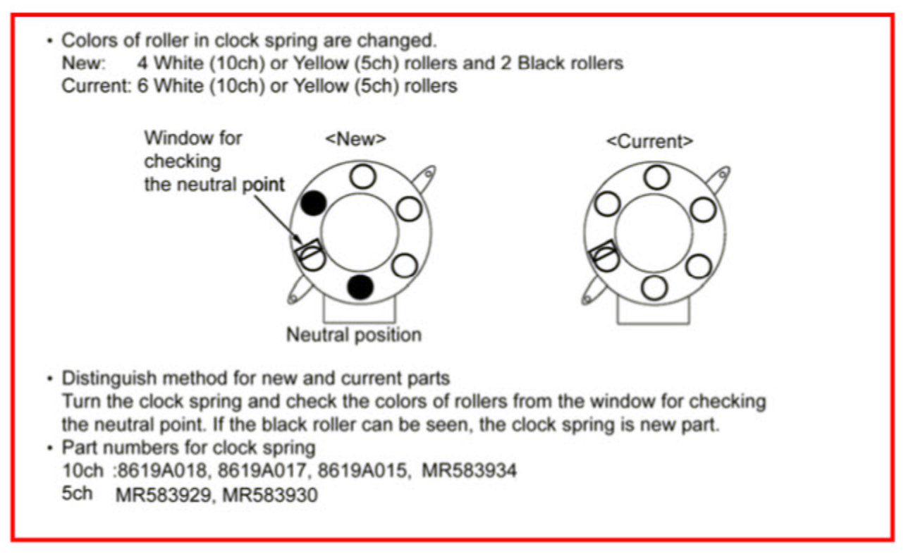 A modified clock spring has been adopted for Service Parts on affected vehicles as of September 2007. New and old style parts are interchangeable. This TSB advises the procedures for alignment of the neutral point of the new clock spring when a part is replaced.