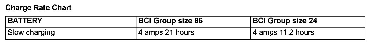 Recommended rate and time for fully discharged condition (flat discharged) is shown above. When the specific gravity of electrolyte keeps 1.22 to 1.29 for more than one hour, charging should be stopped.