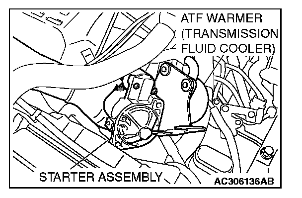 Remove the starter assembly from the side of ATF warmer (transmission fluid cooler).