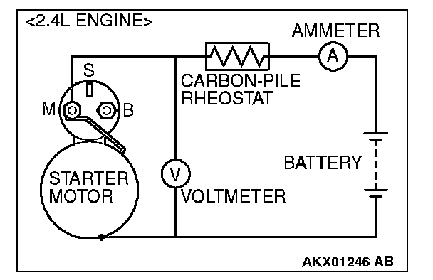 2. Connect a test ammeter (100-ampere scale) and carbon pile rheostat in series between the positive battery terminal and starter motor terminal.