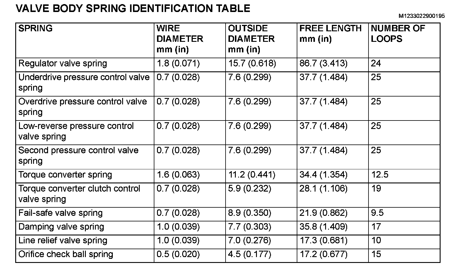 Valve Body Spring Identification Table