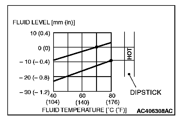 12. Drive the vehicle until the transmission fluid temperature rises to the normal operating temperature [70 - 80°C (158 - 176°F)], and then check the transmission fluid level again. The transmission fluid level must be at the "HOT" mark.