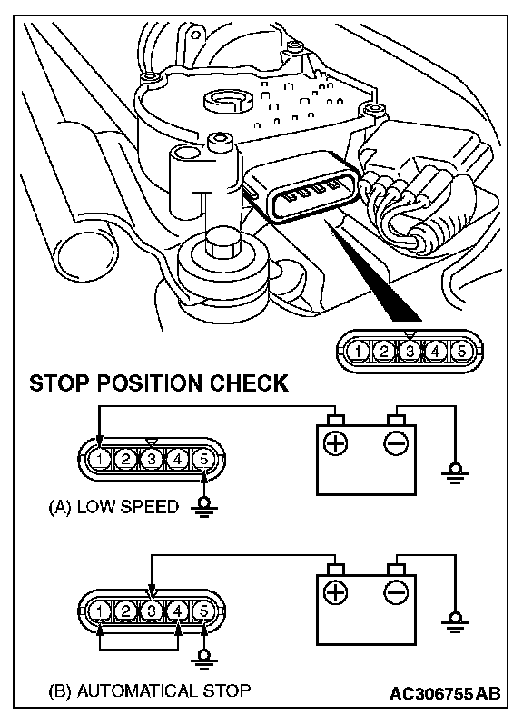 1. Connect the battery to the windshield wiper motor as shown in the illustration (A).