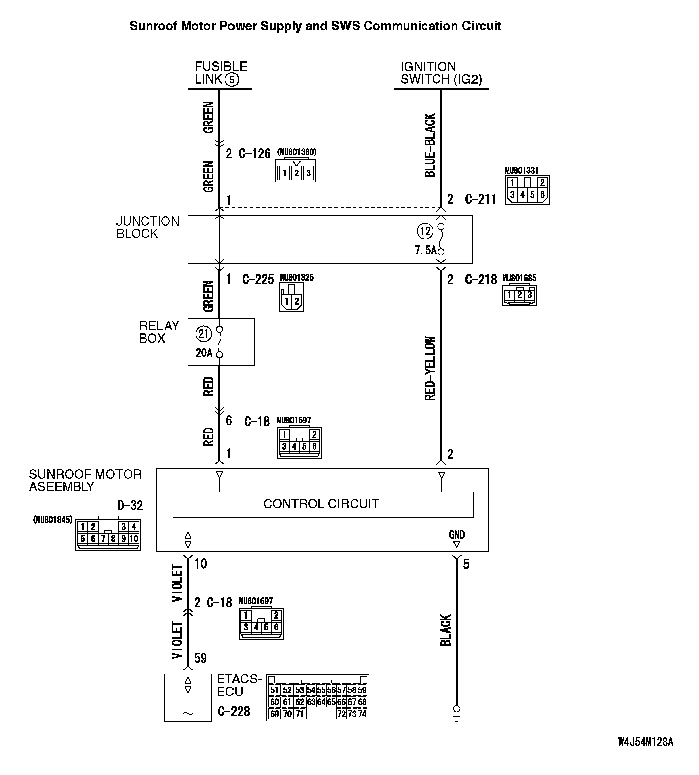 STEP 9. Check the wiring harness between sunroof motor assembly connector D-32 (terminal 10) and ETACS-ECU connector C-228 (terminal 59).