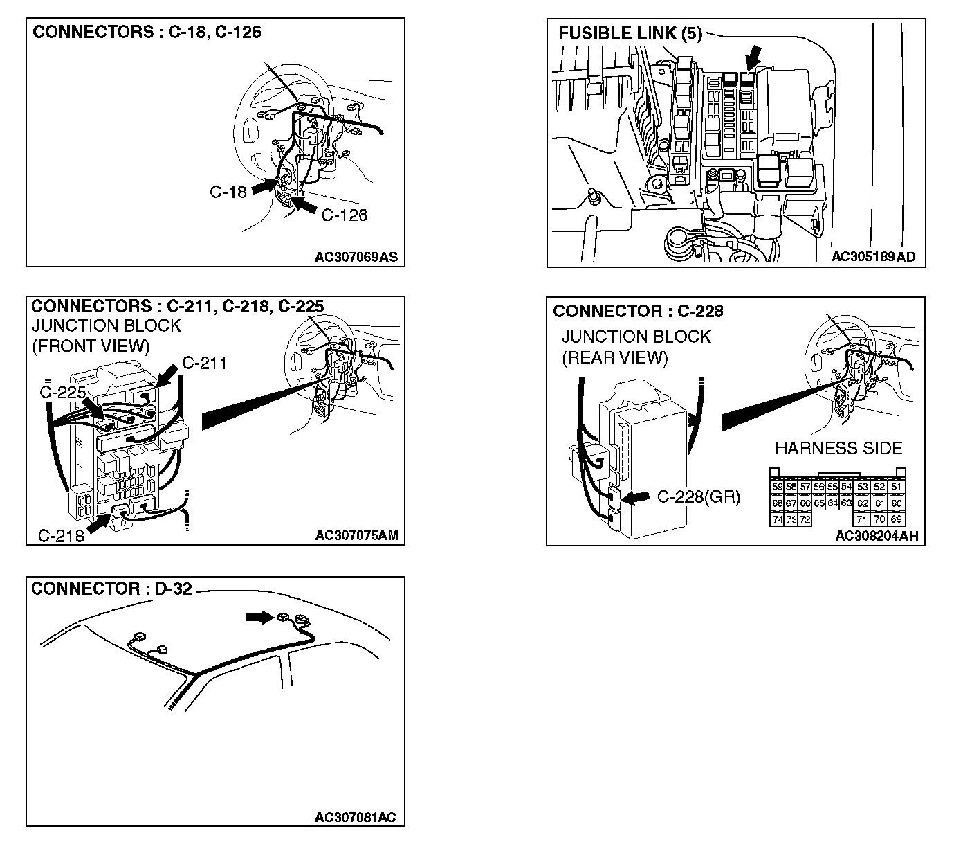 NOTE: Also check intermediate connectors C-18, C-126, junction block connectors C-211 and C-225 for loose, corroded, or damaged terminals, or terminals pushed back in the connector. If intermediate connectors C-18, C-126, junction block connectors C-211 or C-225 are damaged, repair or replace the damaged component(s) as described in Harness Connector Inspection.