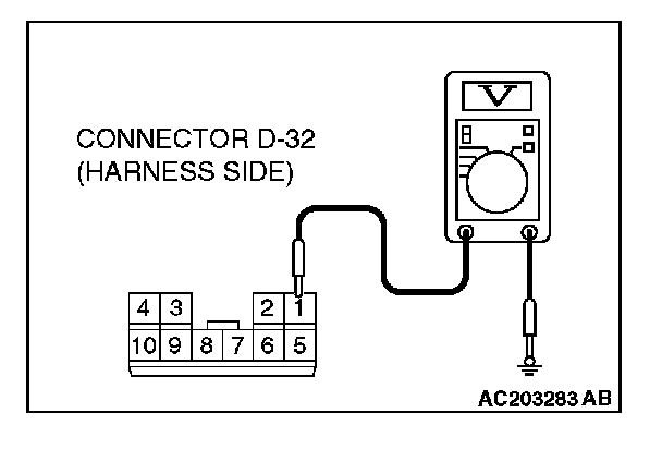 1. Disconnect sunroof motor assembly connector D-32 and measure the voltage available at the wiring harness side of the connector.