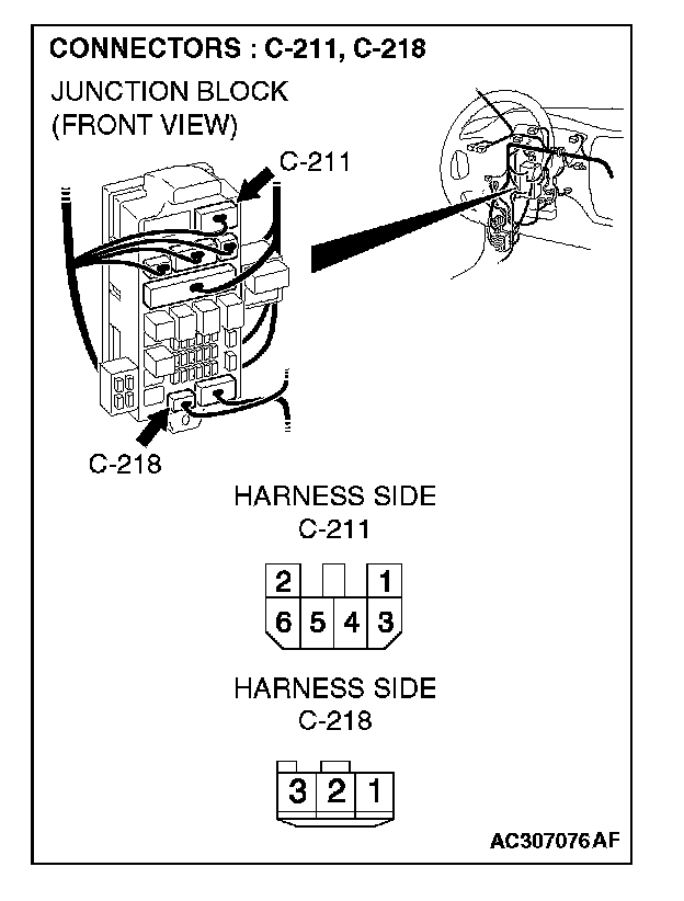NOTE: Also check junction block connectors C-211 and C-218 for loose, corroded, or damaged terminals, or terminals pushed back in the connector. If junction block connectors C-211 or C-218 are damaged, repair or replace the damaged component(s) as described in Harness Connector Inspection.