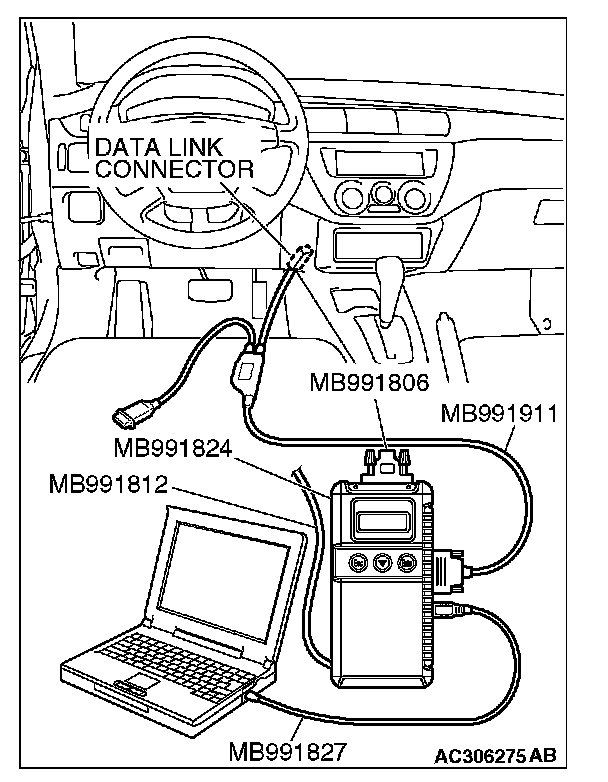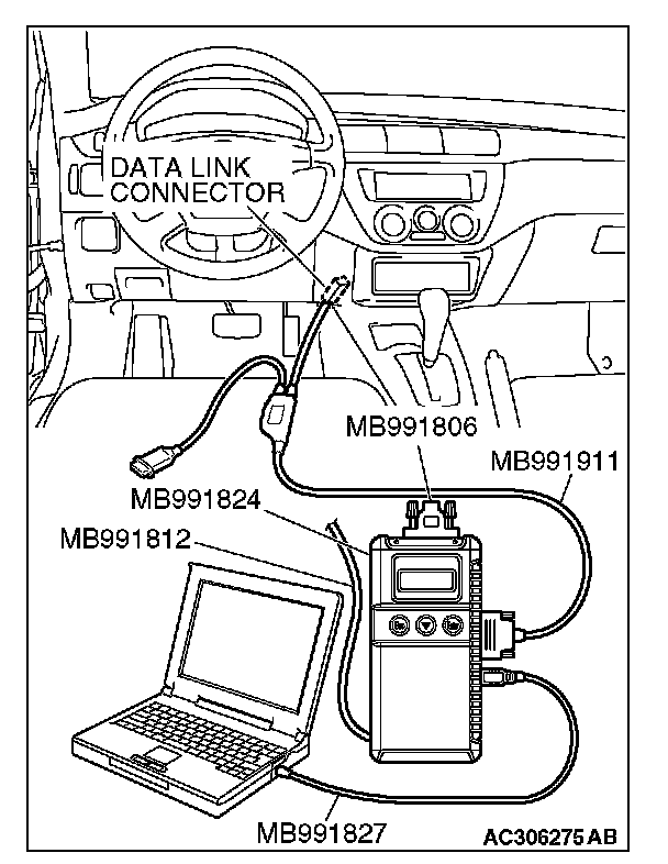 CAUTION: To prevent damage to scan tool MB991958, always turn the ignition switch to the "LOCK" (OFF) position before connecting or disconnecting scan tool MB991958. Connect the DLC harness before connecting the column-ECU harness. Be sure to connect SWS monitor kit MB991813 after turning on scan tool MB991958.