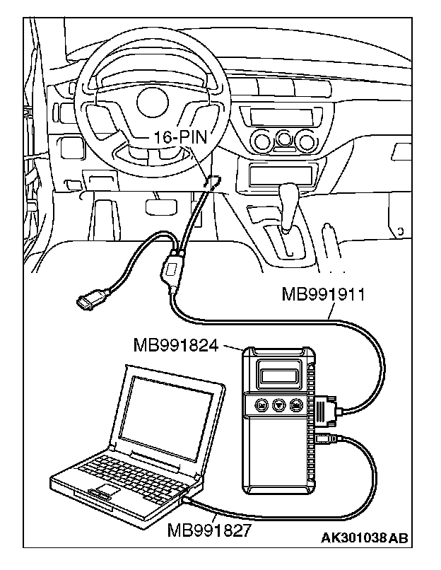 CAUTION: To prevent damage to scan tool MB991958, always turn the ignition switch to the "LOCK" (OFF) position before connecting or disconnecting scan tool MB991958.