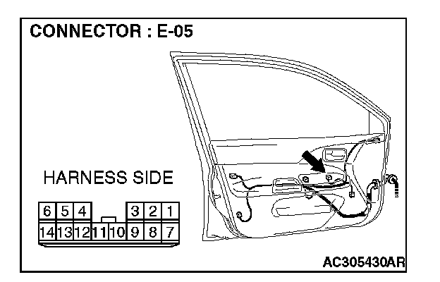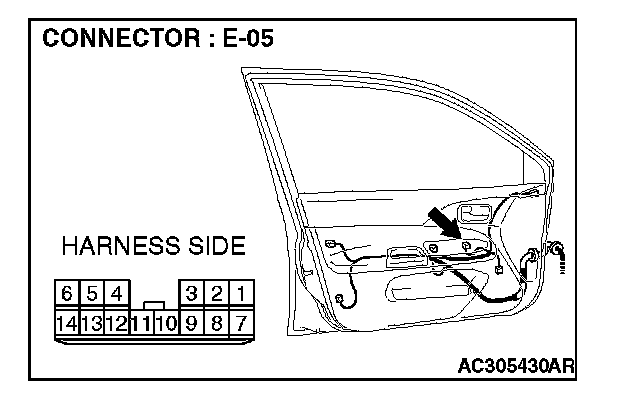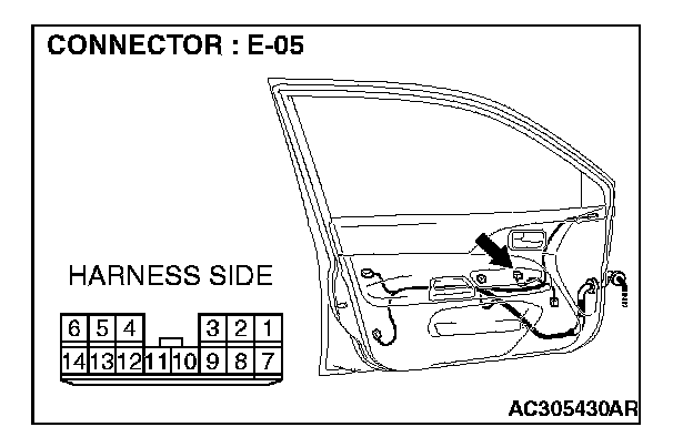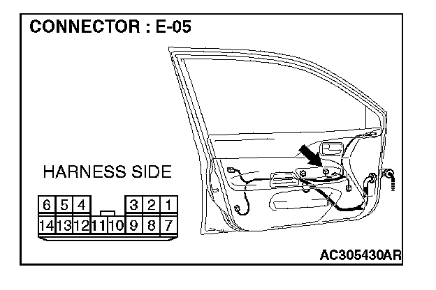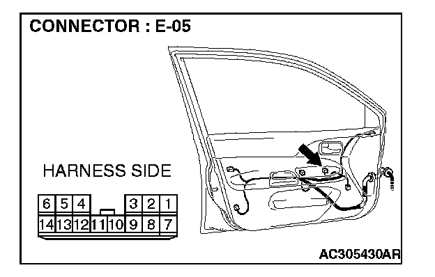 1. Disconnect power window main switch connector E-05 and measure the voltage available at the wiring harness side of the connector.