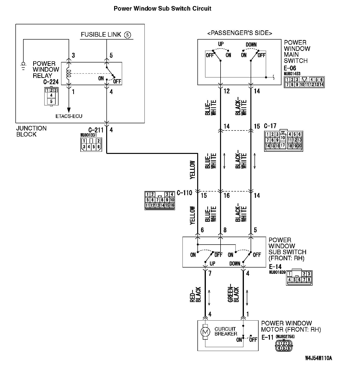 STEP 10. Check the wiring harness between power window relay connector C-224 (terminal 4) and power window sub-switch (front: RH) connector E-14 (terminal 5).