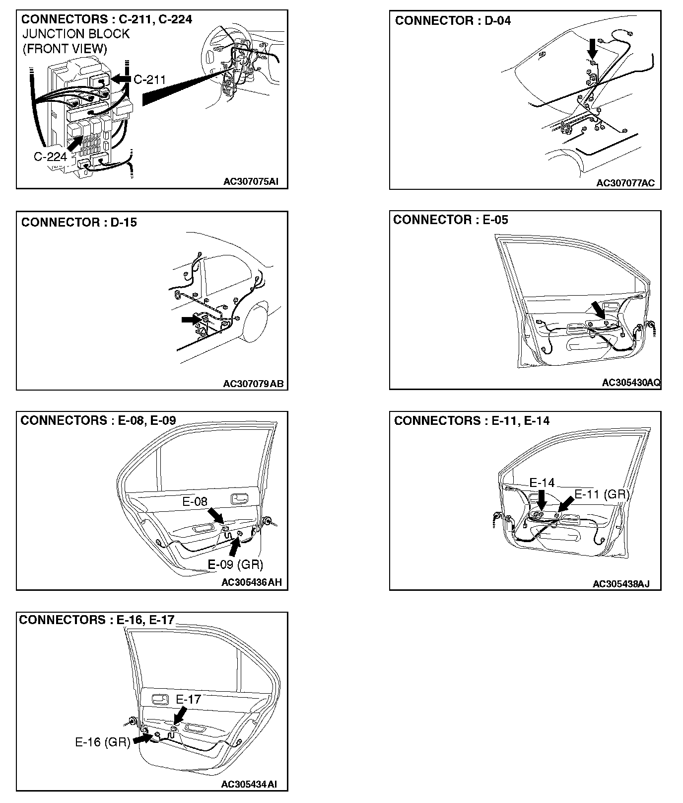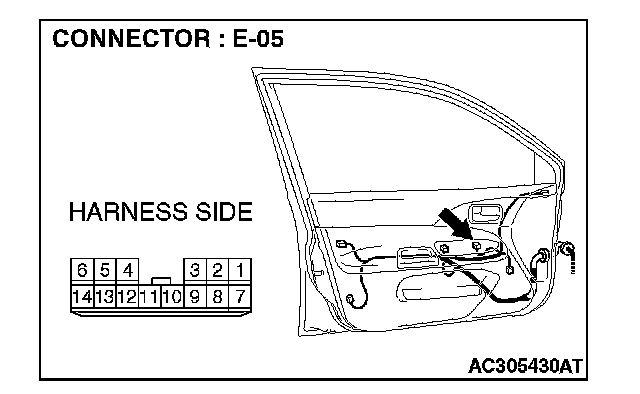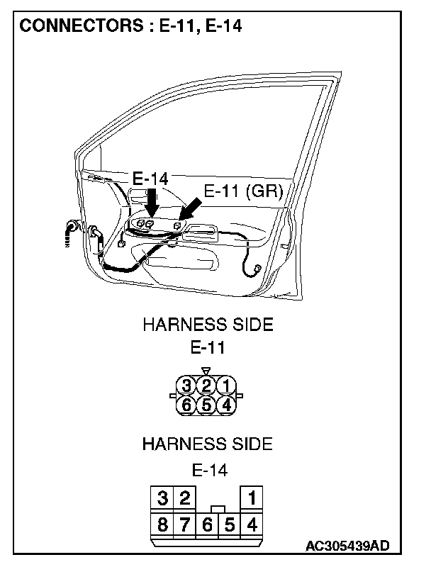 STEP 5. Check power window sub-switch (front: RH) connector E-14 and power window motor (front: RH) connector E-11 for loose, corroded or damaged terminals, or terminals pushed back in the connector.