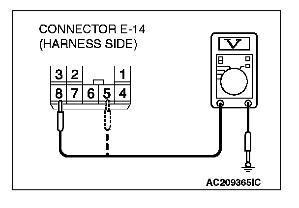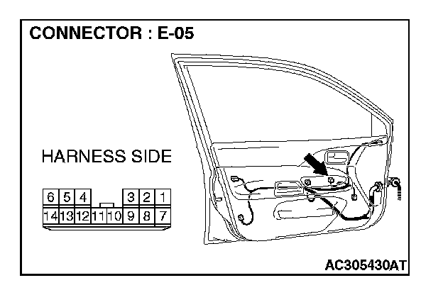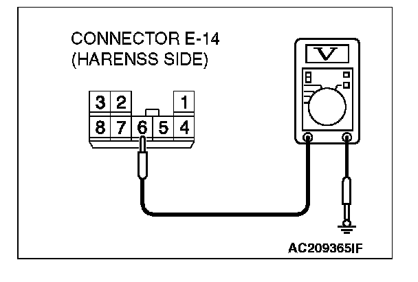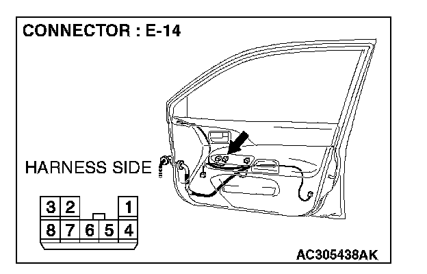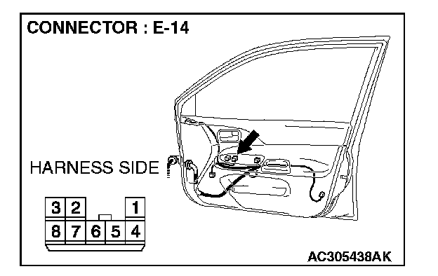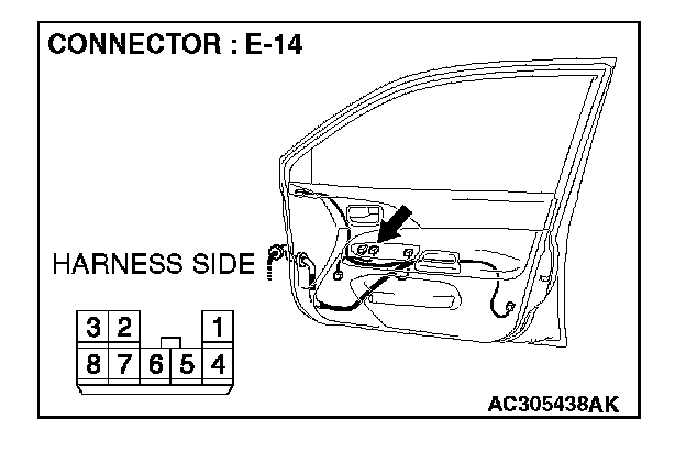 1. Disconnect power window sub-switch (front: RH) connector E-14 and measure the voltage available at the wiring harness side of the connector.