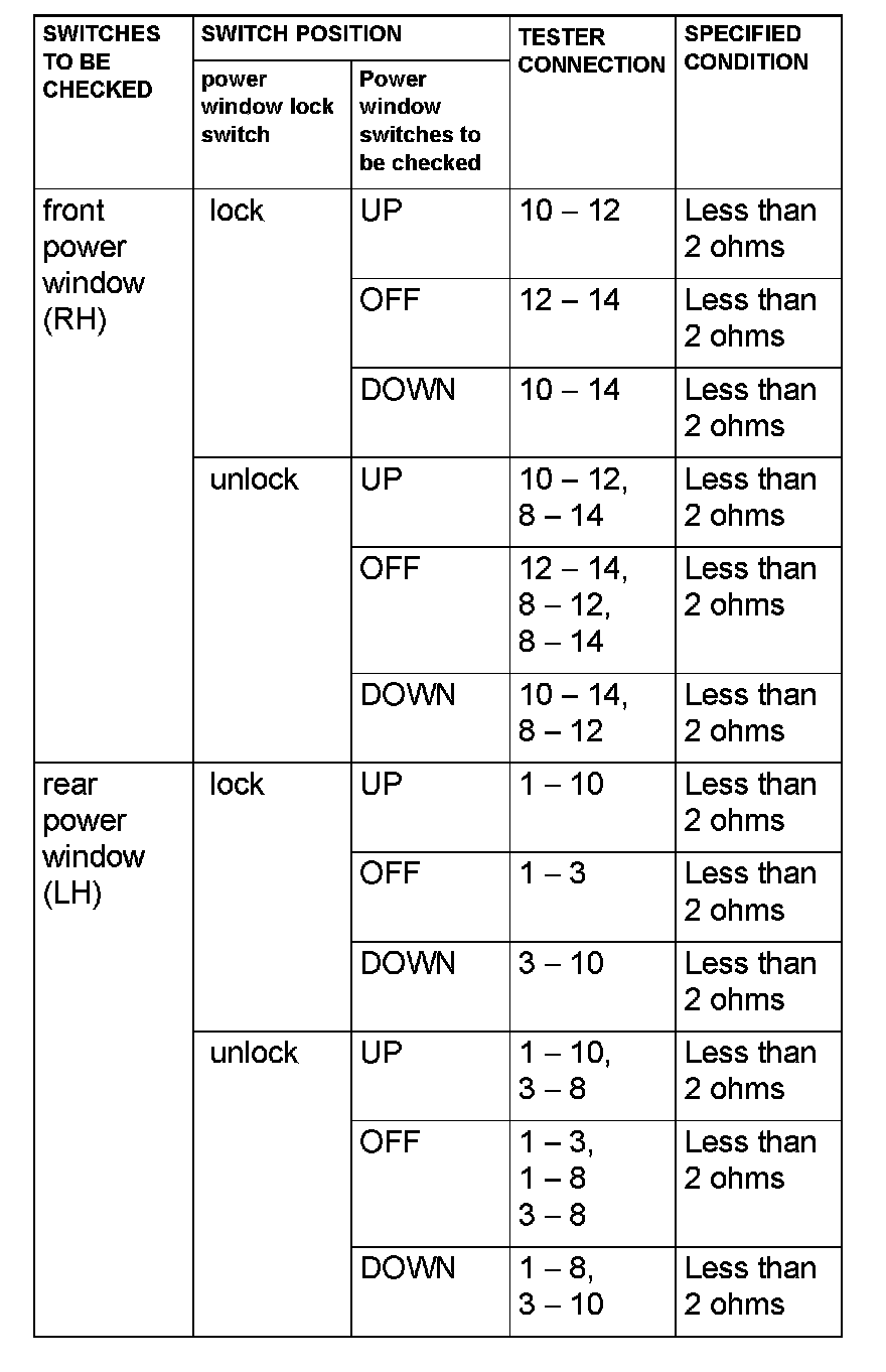 2. Check continuity when the power window sub-switch (rear: LH) is operated to "UP" or "DOWN" position.