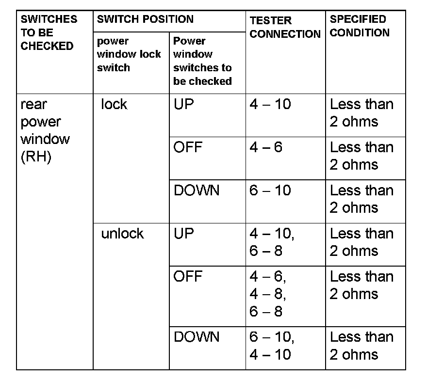STEP 24. Check the power window sub-switch (rear: RH) for continuity.