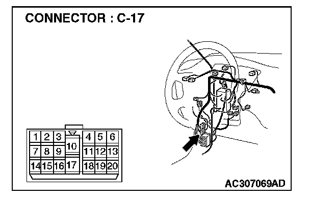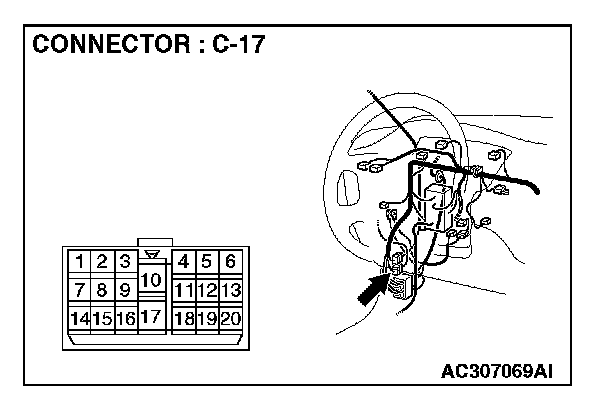 1. Disconnect power window sub-switch (rear: RH) connector E-17 and measure the resistance available at the wiring harness side of the connector.