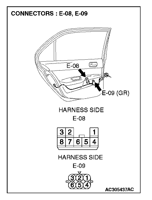 STEP 14. Check power window sub-switch (rear: LH) connector E-08 and power window motor (rear: LH) connector E-09 for loose, corroded or damaged terminals, or terminals pushed back in the connector.