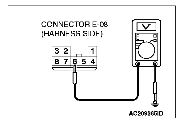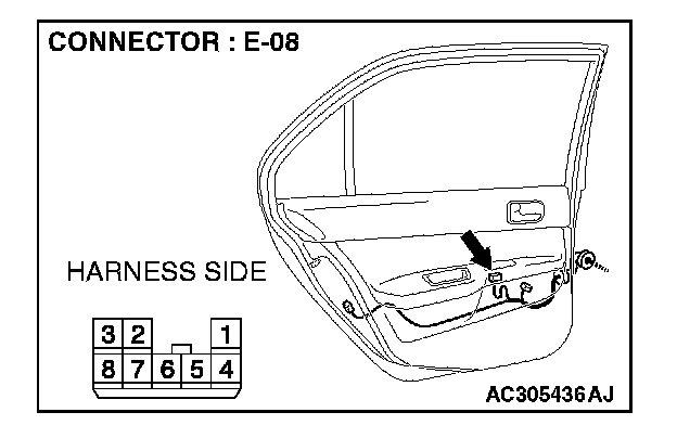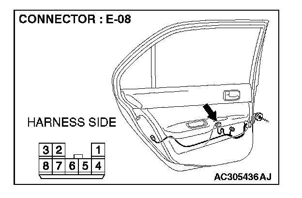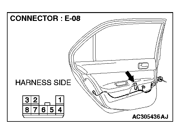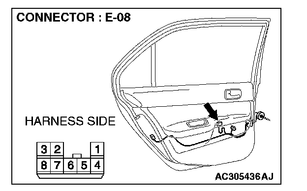 1. Disconnect power window sub-switch (rear: LH) connector E-08 and measure the voltage available at the wiring harness side of the connector.