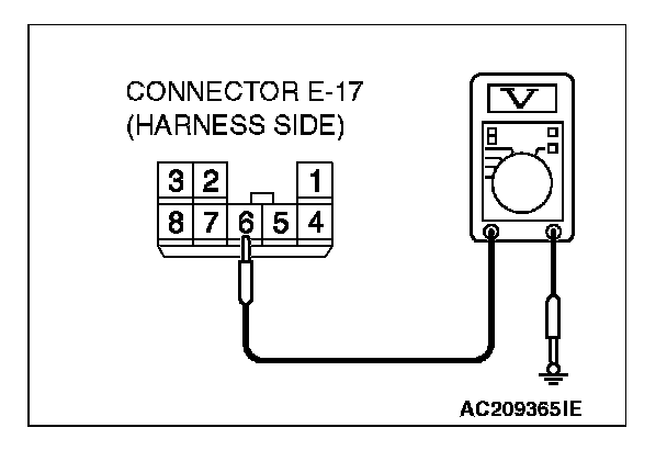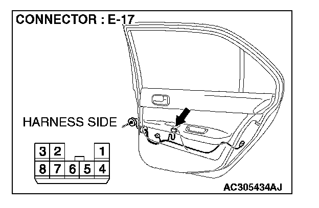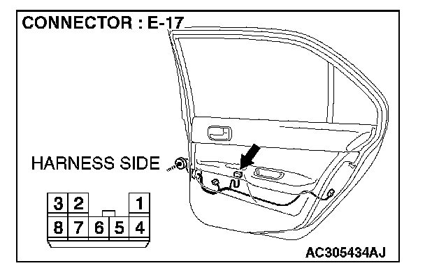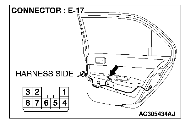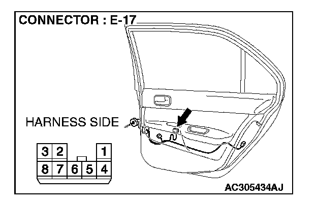 1. Disconnect power window sub-switch (rear: RH) connector E-17 and measure the voltage available at the wiring harness side of the connector.