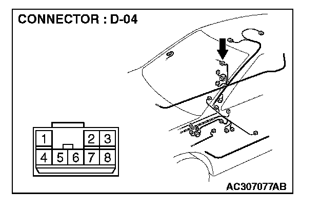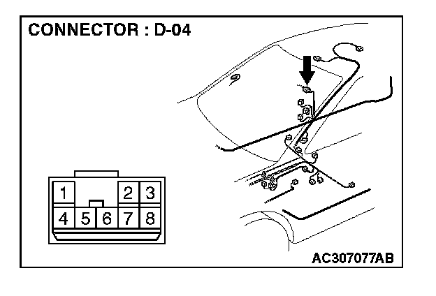 1. Disconnect power window sub-switch (rear: LH) connector E-08 and measure the resistance available at the wiring harness side of the connector.