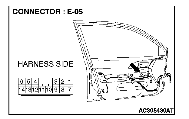 STEP 12. Check the wiring harness between power window main switch connector E-05 (terminals 12 and 14) and power window sub-switch (front: RH) connector E-14 (terminals 8 and 5).