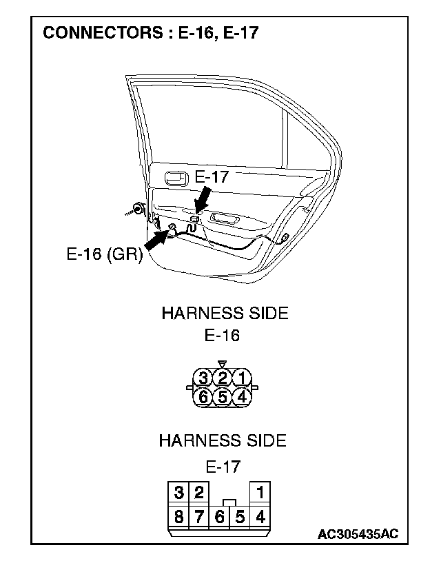 STEP 31. Check the wiring harness between power window sub-switch (rear: RH) connector E-17 (terminal 6 and 7) and power window motor (rear: RH) connector E-16 (terminal 2 and 1).