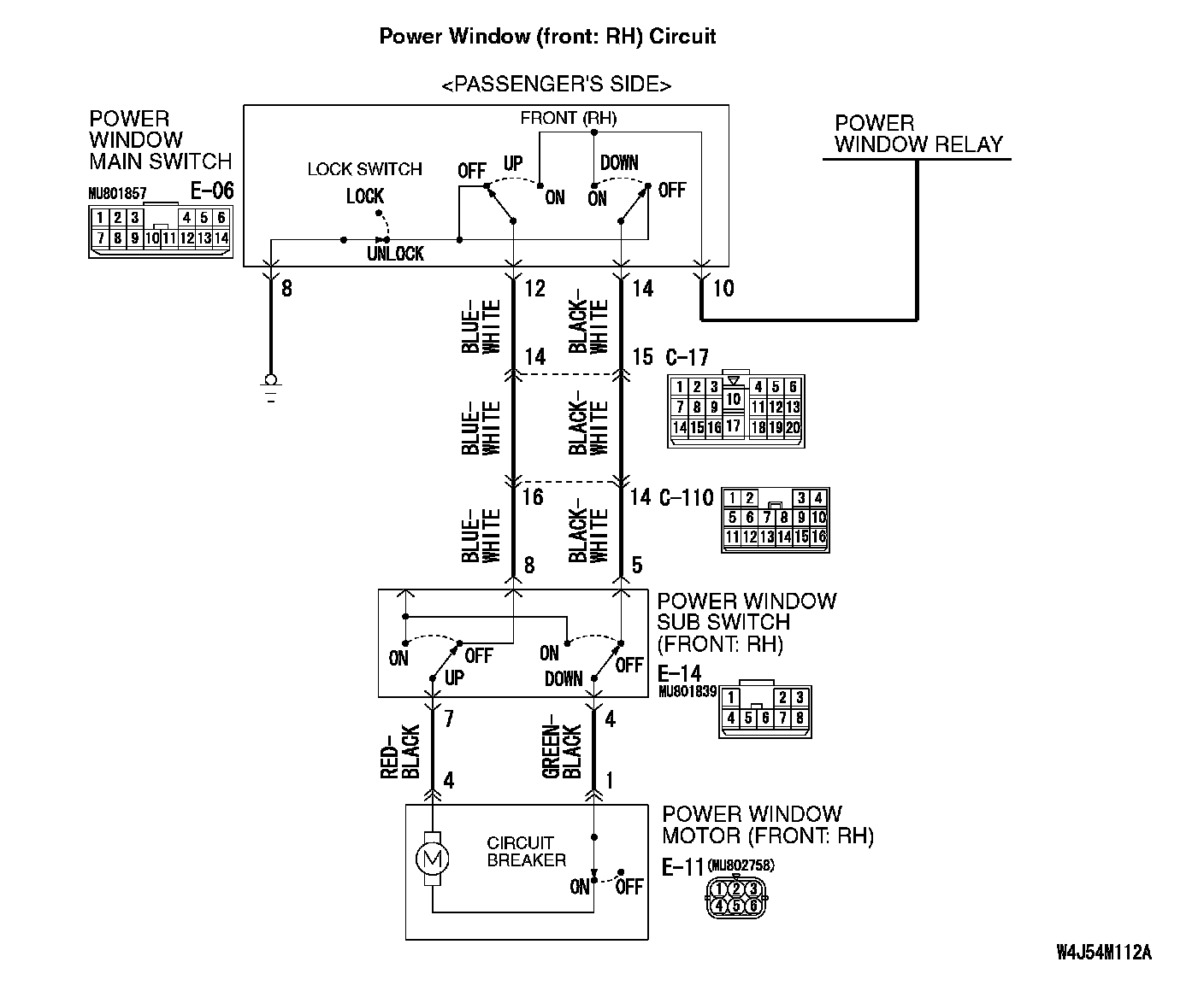 INSPECTION PROCEDURE D-5: Power Windows: Front or rear passenger's power windows do not work at all by operating the power window main switch.Power Window (front:RH) Circuit: