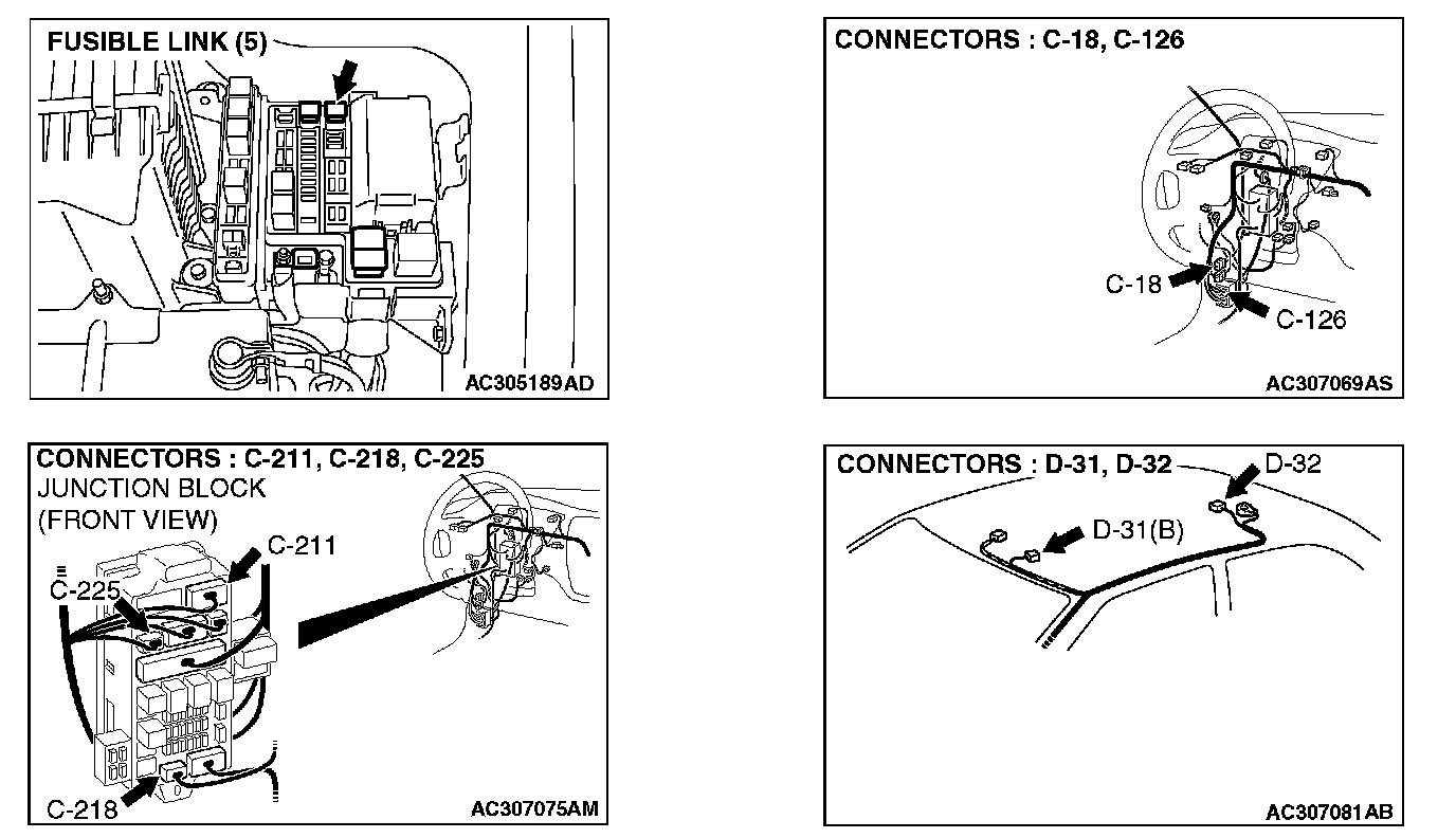 STEP 2. Check the fusible link (5) line of power supply circuit to the sunroof motor assembly. Measure the voltage at sunroof motor assembly connector D-32.