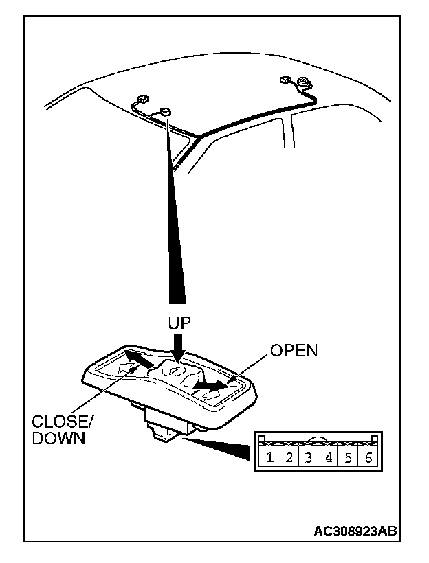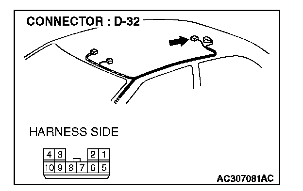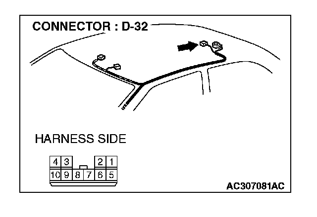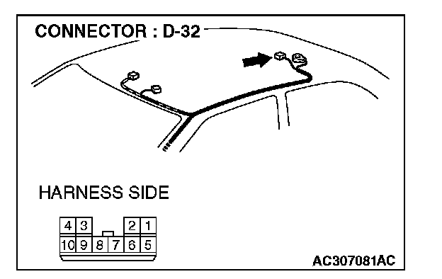 STEP 1. Check the sunroof motor assembly connector D-32 for loose, corroded or damaged terminals, or terminals pushed back in the connector.